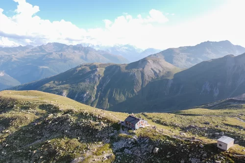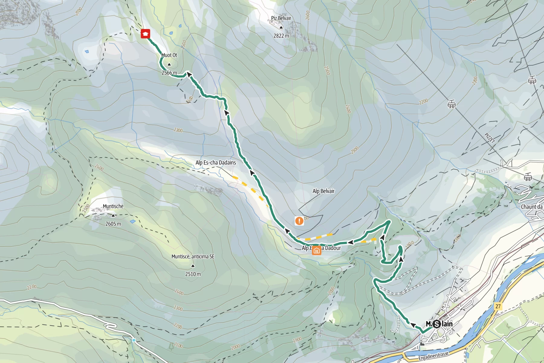 Einige Meter vor der Alp Es-cha Dadains geht dann der Weg rechts hinauf zur Chamanna d'Es-cha. Ein gut sichtbarer Wegweiser zeigt die Abzweigung an. Der Höhengewinn (900 hm) über die sonnigen Hänge ist zwar etwas schweisstreibend, doch die Aussicht auf das Engadin von der Hüttenterrasse aus entschädigt reichlich für die Mühen.