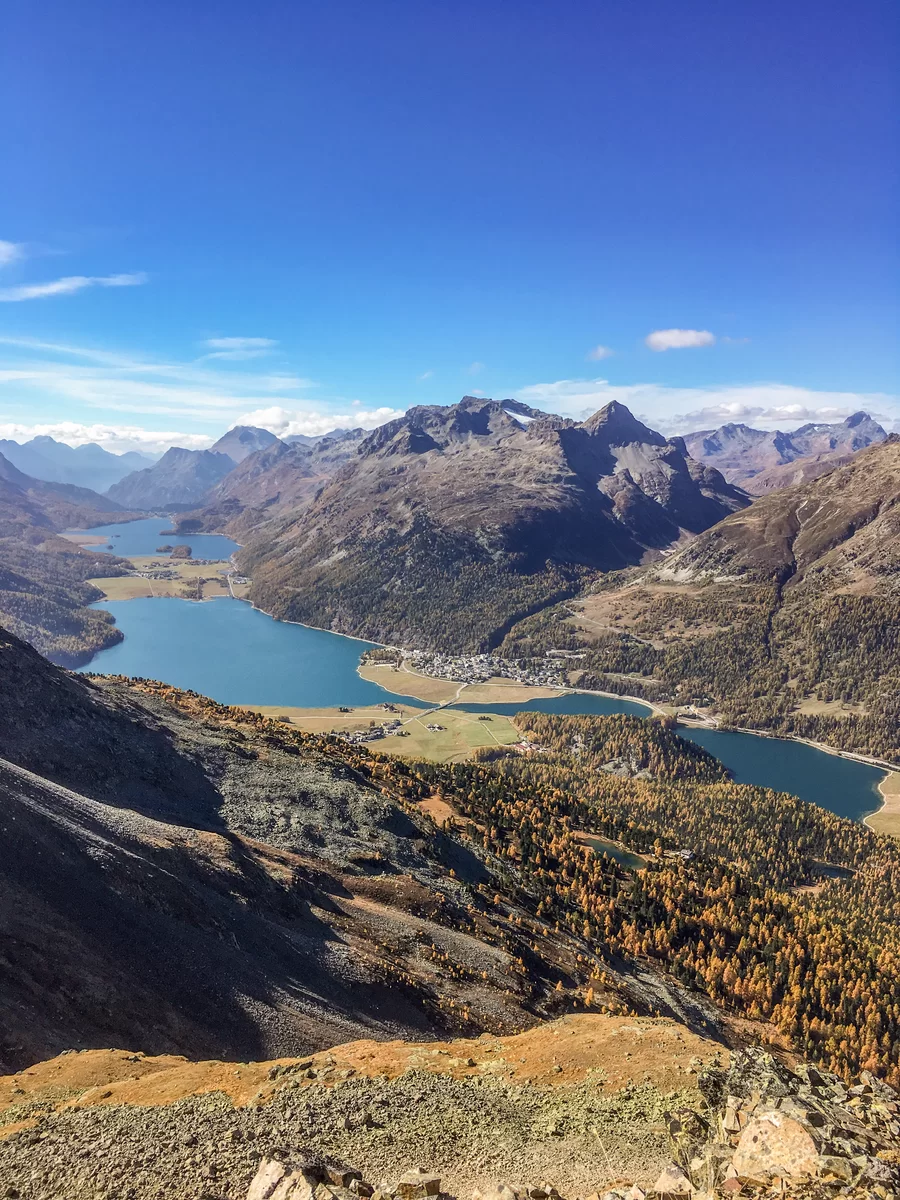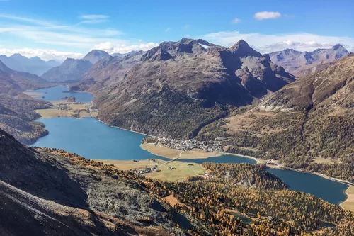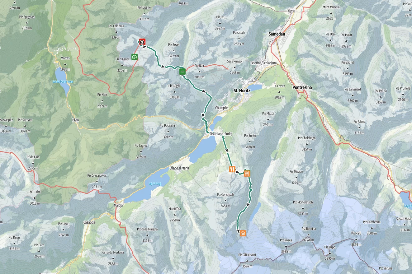 Über den ausgeschilderten Weg zur Fuorcla Suvretta und Abstieg zum Lej Suvretta. Talauswärts zur Alp Suvretta und weiter dem Panoramaweg folgend nach Silvaplana hinunter. Auf der anderen Talseite bei Surlej führt die Luftseilbahn Corvatsch zur Mittelstation Murtèl. Von Silvaplana kann auch der Engadinbus nach Surlej genommen werden. Von der Mittelstation Murtèl geht die Wanderung weiter über die Fuorcla Surlej auf dem eindrücklichen Panoramaweg mit Blick auf das Bernina-Massiv bis zur Chamanna Coaz.