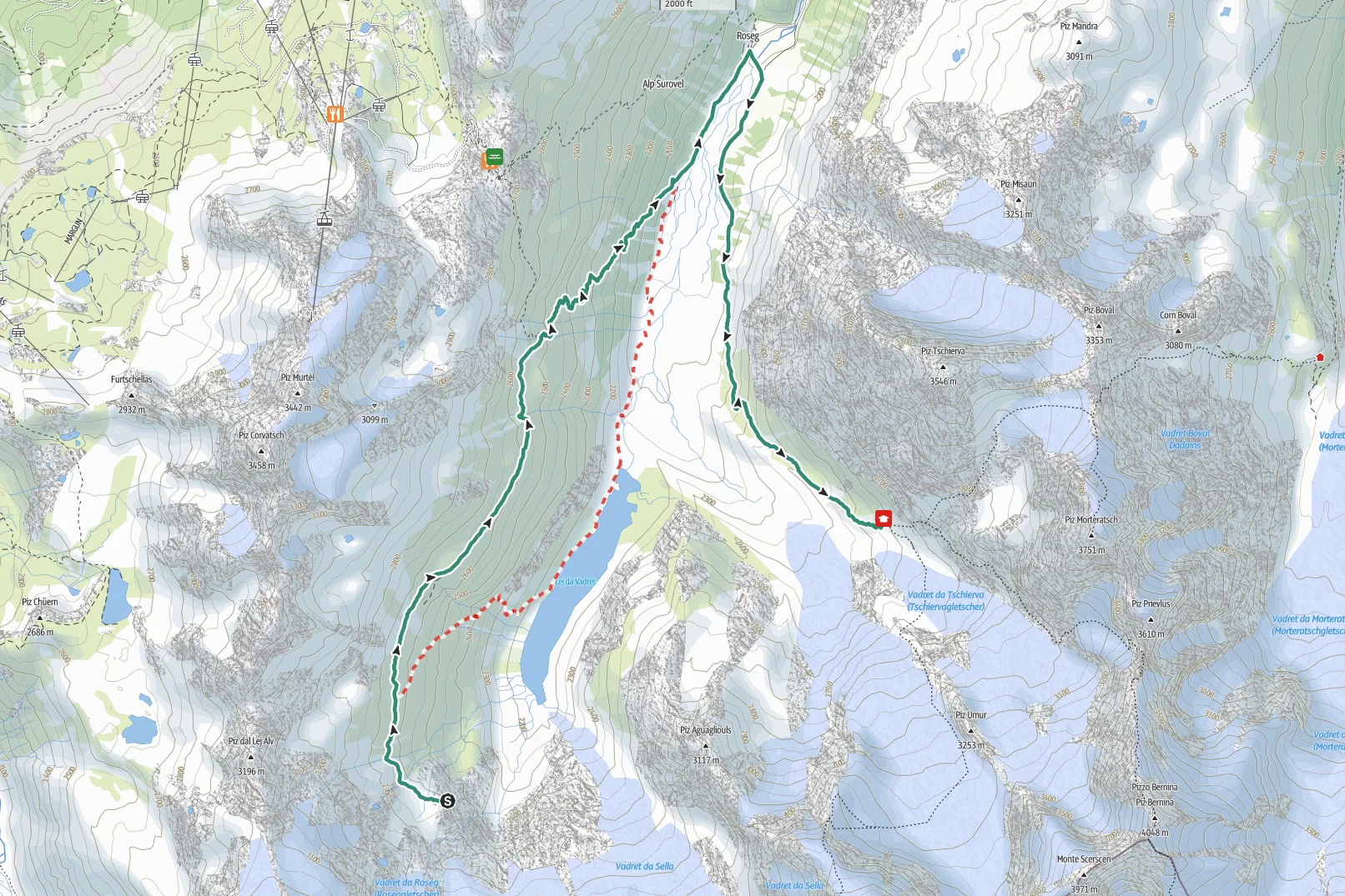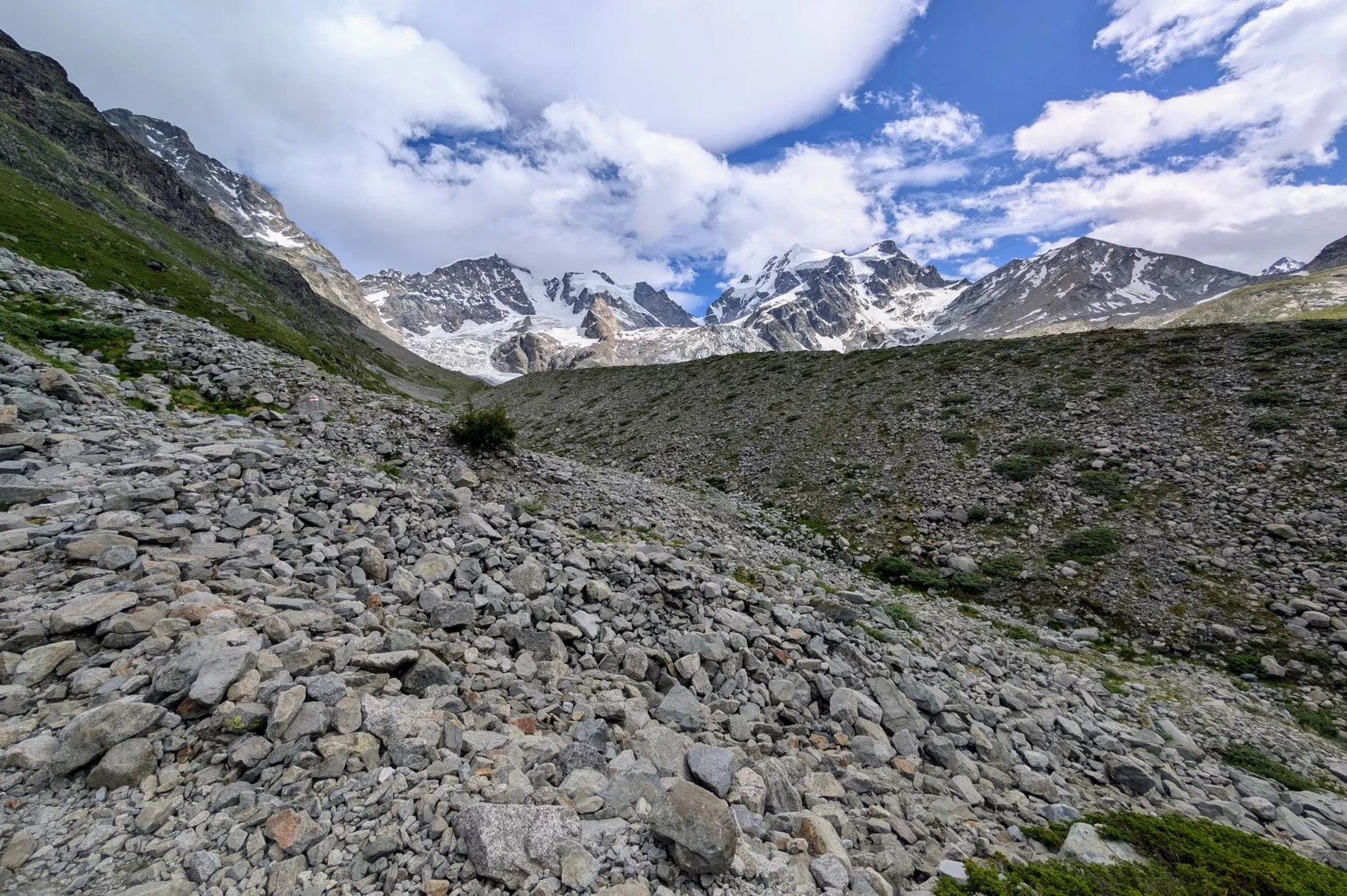 Auf einem der schönsten Höhenwege der Alpen wandern Sie hoch oberhalb des Val Roseg. Nach etwa einer Stunde führt Sie der Bergwanderweg hinunter zum Restaurant Roseg Gletscher. Kurz bevor man dieses erreicht, zweigt der Weg rechts ab über eine Brücke und steigt am gegenüberligenden Hang hoch zur Chamanna da Tschierva. Diese ist Ausgangspunkt für die Besteigung des bekannten Biancogrates auf den Piz Bernina, den einzigen 4000er Graubündens und der Ostalpen.