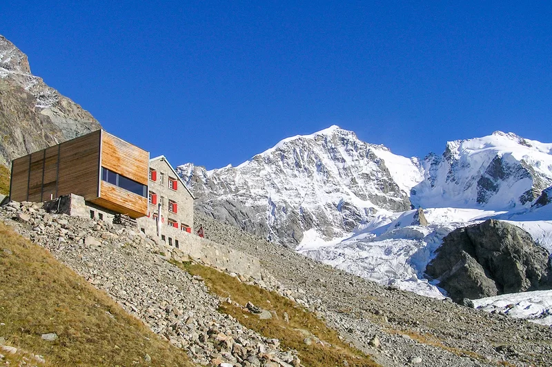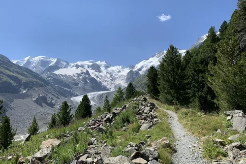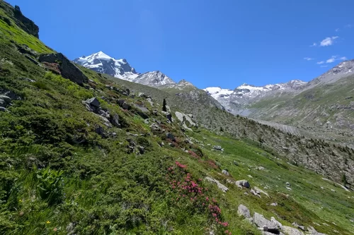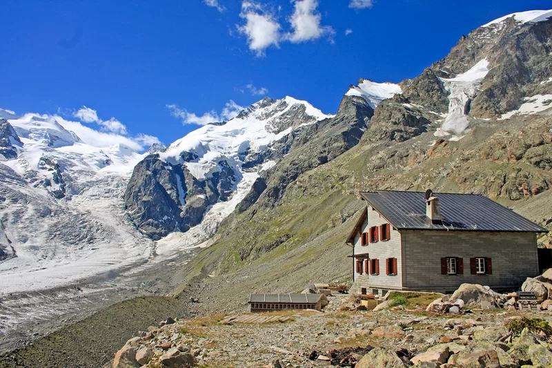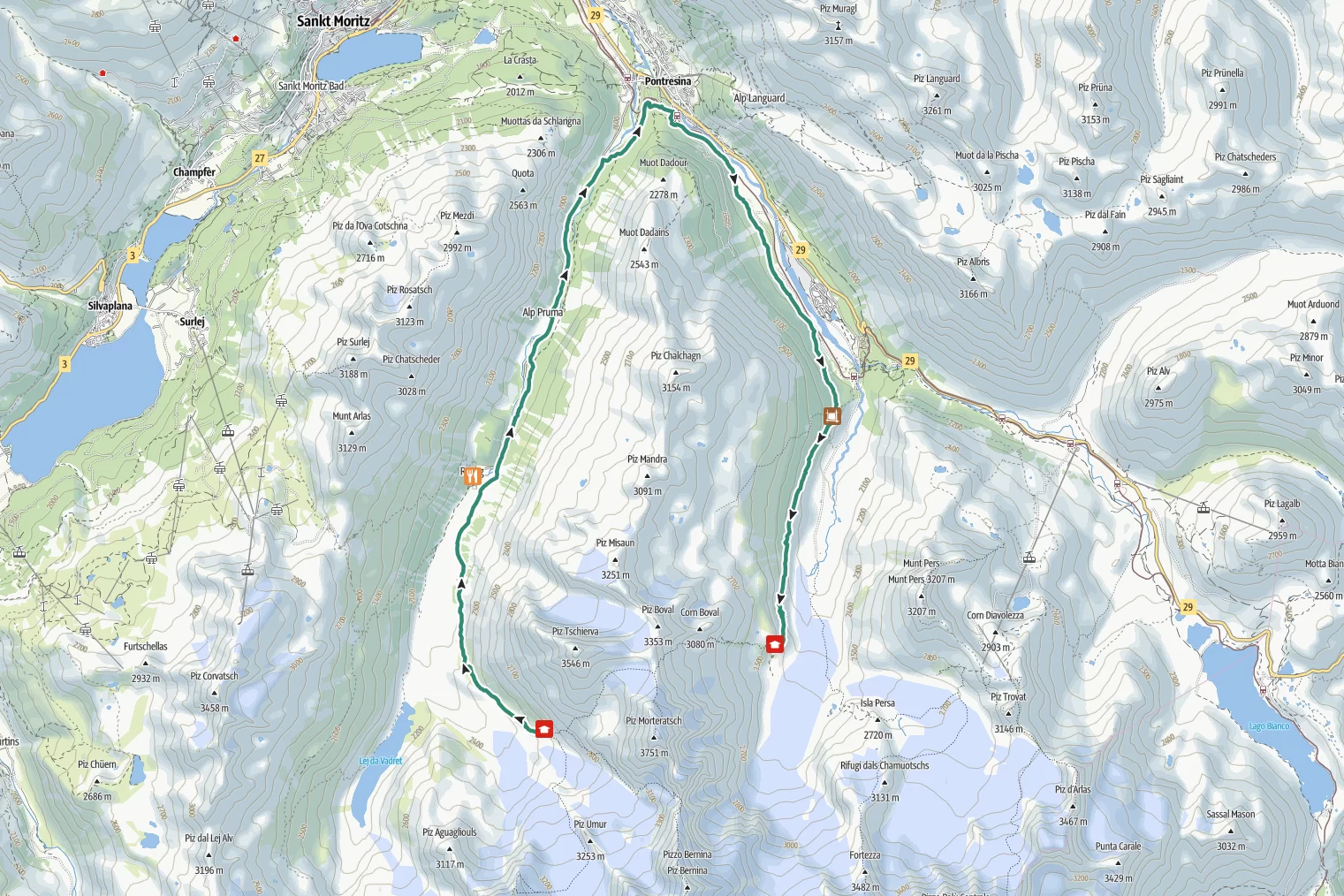 Der Abstieg durch das Val Roseg bringt uns nach Pontresina. Im oberen Teil des Tales hat man gute Chancen, Gämsen und Murmeltiere zu sehen. Der untere Teil führt am Fluss Ova da Roseg entlang durch einen Lärchen- und Arvenwald. Es wird empfohlen nach dem Hotel Roseg Gletscher den markierten Wanderweg rechter Hand nach Pontresina zu nehmen und nicht die breite Fahrstrasse. In Pontresina weiter durch den Taiswald, dann der Bahn entlang bis zur Bahnstation Morteratsch. Selbstverständlich kann man für diese Strecke auch die Bahn (Station Surovas) nehmen. Hinter der Bahnstation Morteratsch liegt linker Hand die Alpschaukäserei Morteratsch - ideal für eine Pause. Anschliessend überqueren wir die Gleise und nehmen den markierten Weg zur Chamanna da Boval über die Chünetta. Der Aufstieg führt durch einen immer lichter werdenden Arvenwald und auf aussichtsreichem Weg hoch über dem Morteratschgletscher zum Tagesziel.