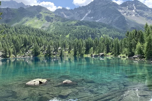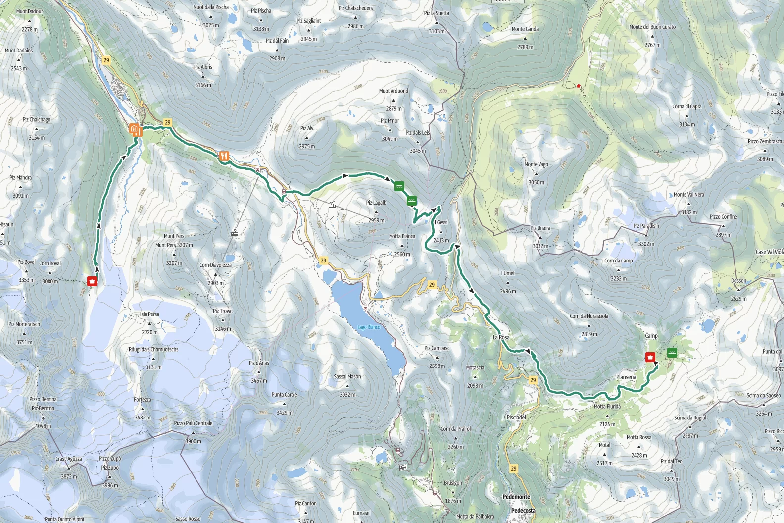 Abstieg auf dem markiertem Weg vom Vortag zum Bahnhof Morteratsch. Dem Wasserfall, der Cascada da Bernina entlang hoch nach Bernina Suot und den Bahngleisen folgend nach Lagalb. Wer möchte, kann in Morteratsch in die Rhätische Bahn einsteigen und bis Lagalb fahren. Wanderung durch das Val Minor zum gleichnamigen See (Lej Minor), vor dem Sattel (Fuorcla Minor) den neuen Markierungen folgend Richtung Forcola di Livigno bis Höhenkurve 2300 m, dann ein kurzes, steiles Stück weglos direkt absteigend zur (sichtbaren) Passstrasse nach Livigno, weiter der Passstrasse und dem Wanderweg entlang nach La Rösa. Von La Rösa über Salva nach Lungacqua ins Rifugio Saoseo in der Nähe des gleichnamigen Sees. Der kurze Aufstieg zu diesem traumhaft gelegenen See ist unbedingt empfehlenswert!