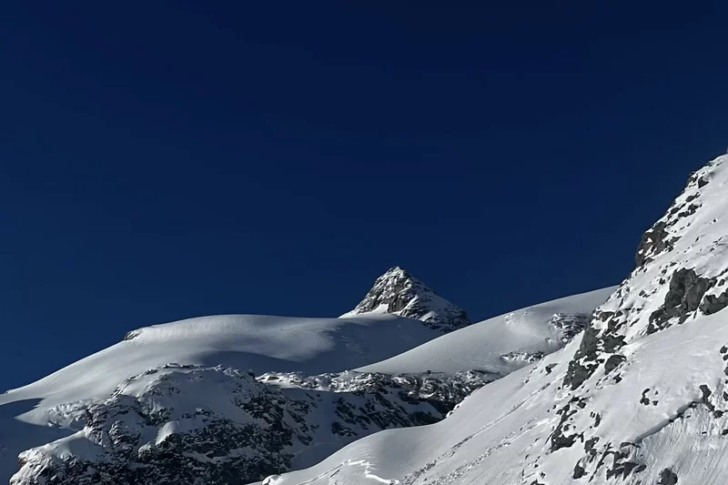 Luftseilbahn Surlej – Murtèl – Corvatsch, Abfahrt mit zwei, durch Fixseile gesicherte Passagen, mit Tourenski ca. 1.5 - 2 h ab Bergstation Corvatsch bei optimalen Verhältnissen.