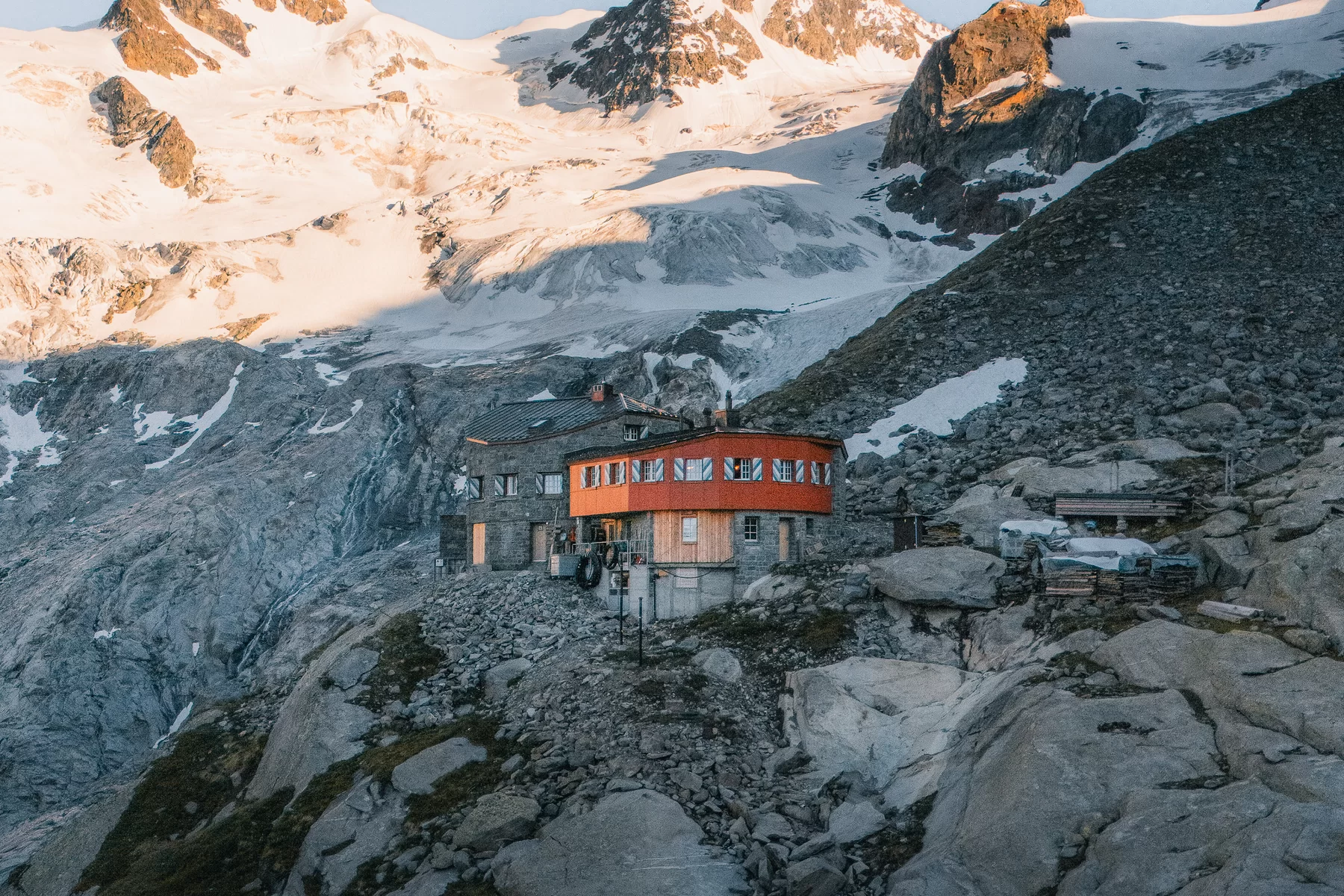- Aufgrund von Hangabsenkungen durch den Rückzug des Gletschers wurde die Hütte 1964 an ihren heutigen Standort versetzt.
